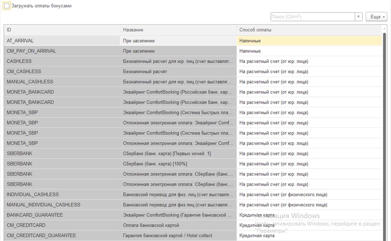 - В разделе Способы оплаты задаётся сопоставление между вариантами оплаты в Travelline и 1С:Отель.