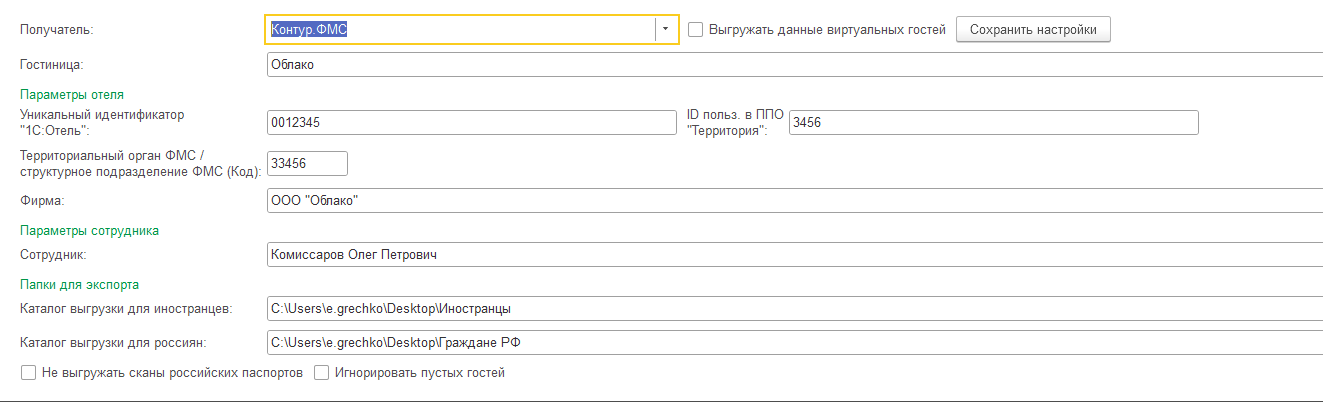 Выгрузка данных гостей в систему миграционного учёта производится посредством встроенной обработки ExportGuestsToUFMSTerritoryApp, которая формирует файл формата XML для его дальнейшей загрузки в личном кабинете в системе миграционного учета. Файл с данными содержит в себе информацию по проживающим в отеле гражданам РФ и гражданам иностранных государств.