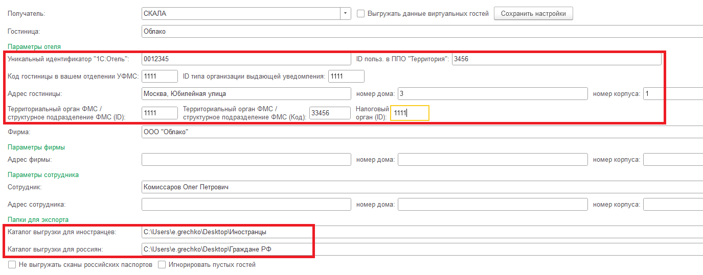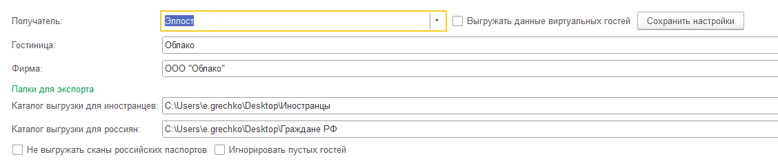 3. Для системы миграционного учета Элпост указываются основные параметры: Фирма, Гостиница и каталоги для выгрузки данных.