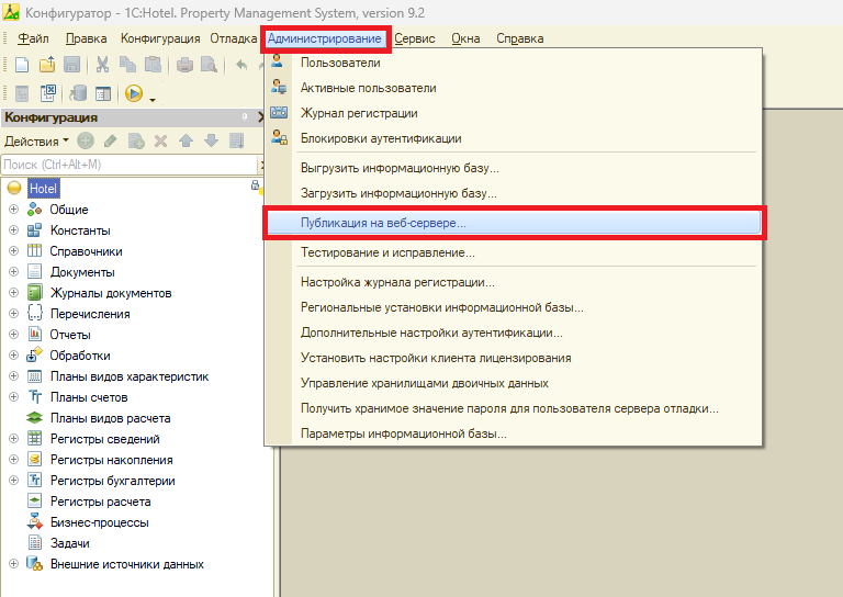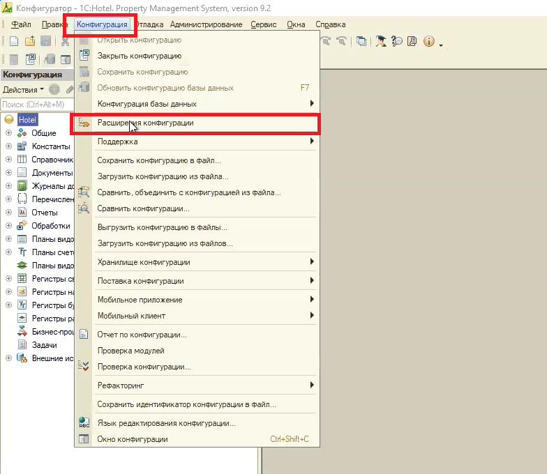 1) Запустить 1С:Отель в режиме конфигуратора.