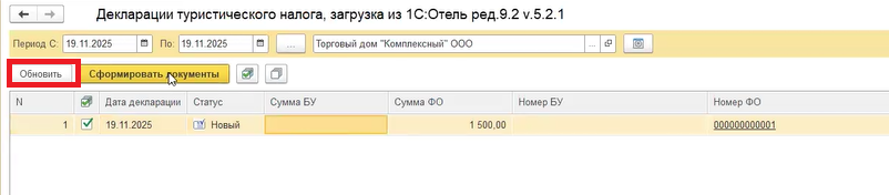 В списке документов будет отображаться декларация, загруженная из 1С:Отель, в статусе Новый, - это документ, который не был загружен в бухгалтерию. Для загрузки декларации нажмите Сформировать документы.