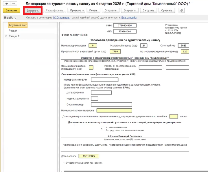 4. Сформируйте Декларацию по туристическому налогу в программе 1С:Отель.