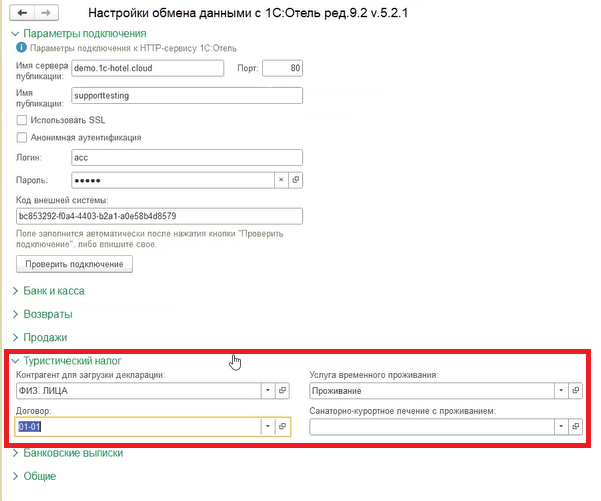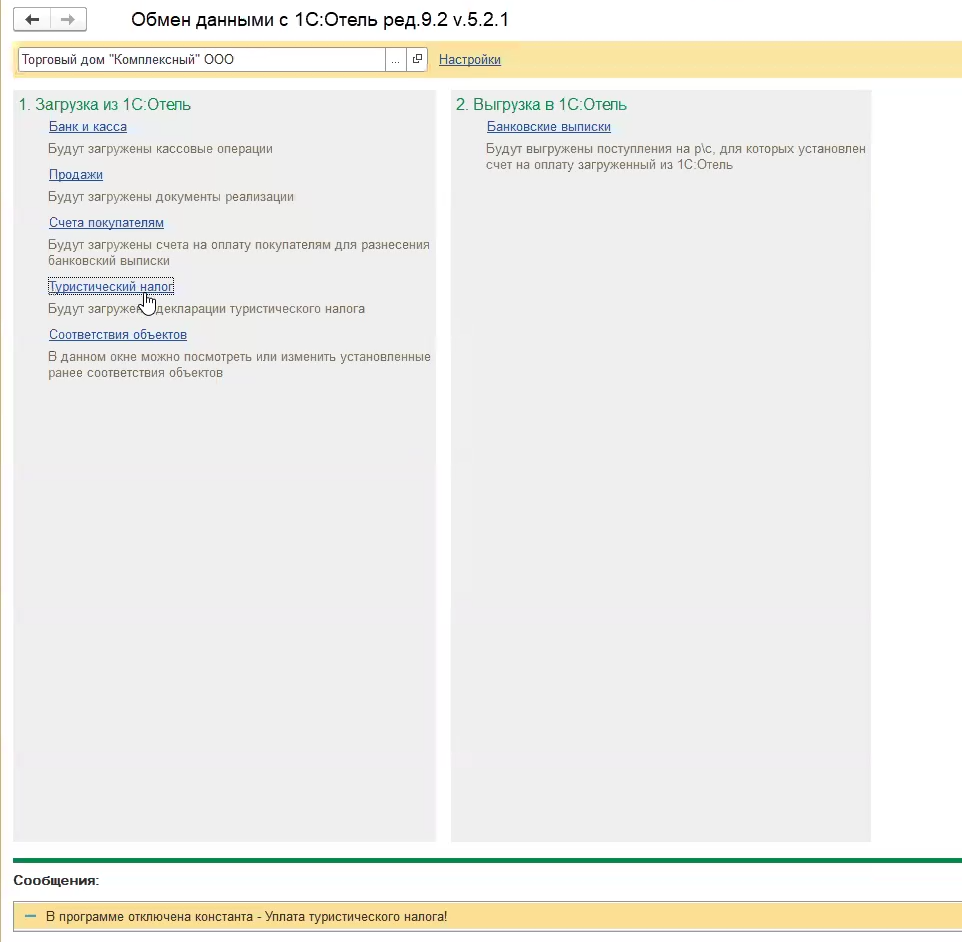 Флаг Туристический налог обязателен к установке. Если флаг не установлен, то раздел Туристический налог в обмене данными с 1С:Отель будет недоступен (ошибка В программе отключена константа – Уплата туристического налога).