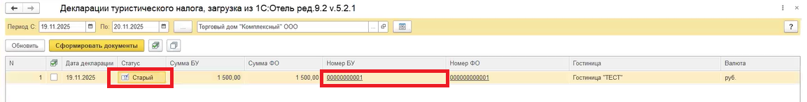 Документу установится статус Старый и будет присвоен Номер в бухгалтерской системе – декларация успешно загружена.