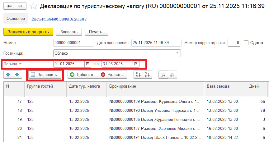 В декларацию попадут все гости, у которых Дата тур.налога в размещении попадает в период формирования. Дата тур.налога рассчитывается исходя из настроек, внесенных в п.1 данной инструкции (Настройка тур.налога в базе 1С:Отель).