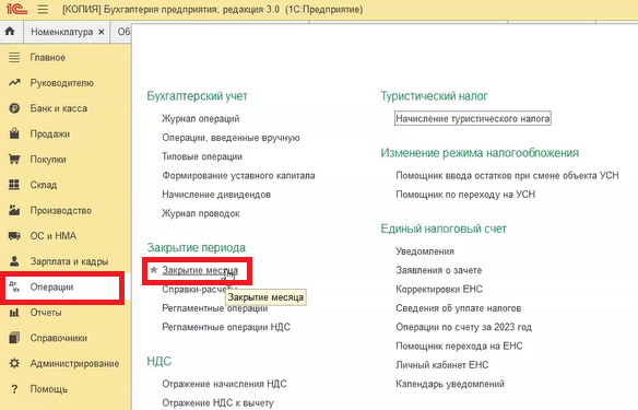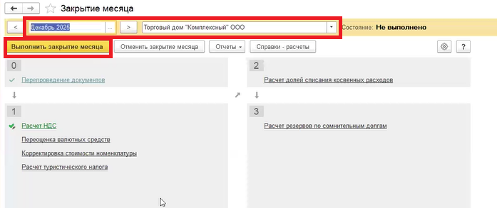 Выберите период и фирму, по которой будет проводиться закрытие. Нажмите Выполнить закрытие месяца.