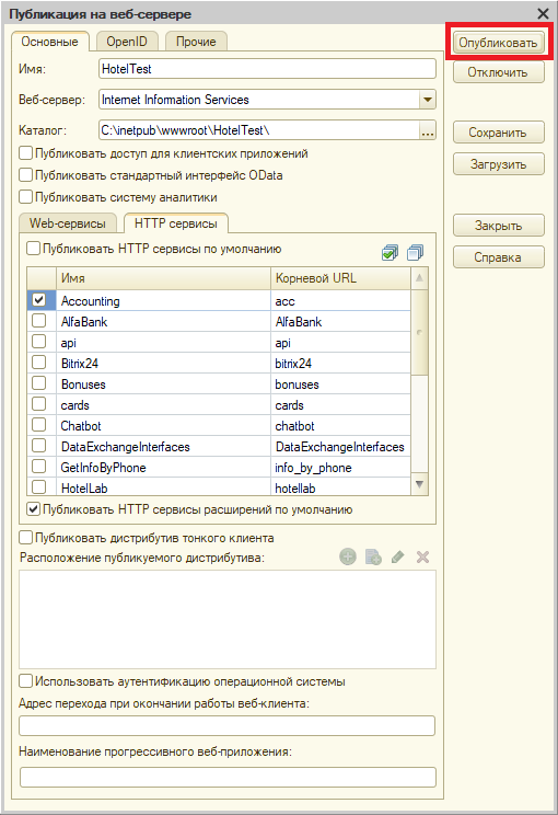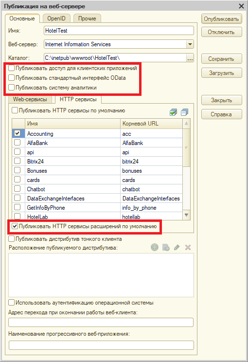 Обязательно установите флаг Публиковать HTTP сервисы расширений по умолчанию.
