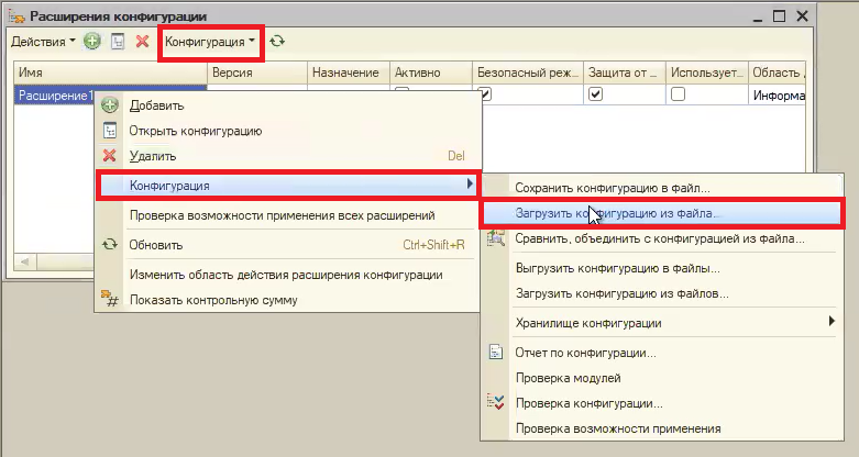 5) В окне с расширениями разверните команду Конфигурация/Конфигурация/Загрузить конфигурацию из файла.