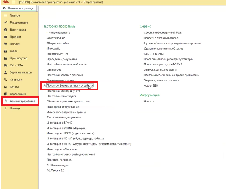 1) Обновите в 1С:Бухгалтерии обработку обмена с 1С:Отель. Для этого откройте подсистему Администрирование/Печатные формы, отчеты и обработки.