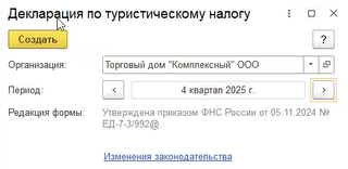 - использовать актуальную версию программы 1С:Бухгалтерия, в которой реализована логика расчета Декларации по туристическому налогу;