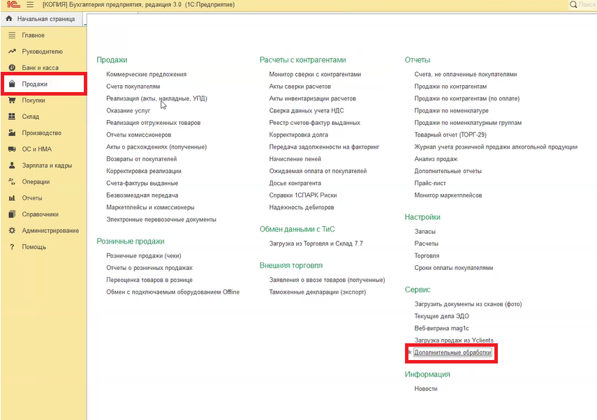 Для этого перейдите в раздел Продажи/Дополнительные обработки.