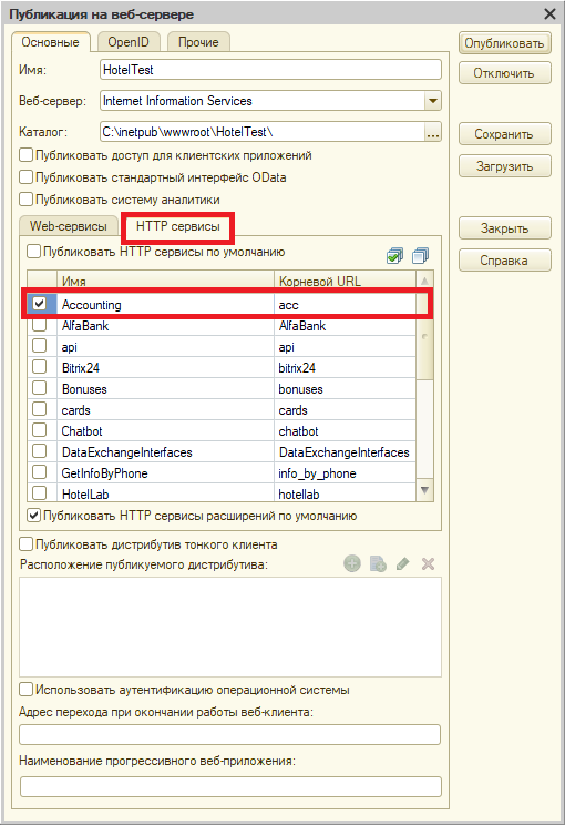 - На вкладке HTTP-сервисы установите флаг напротив сервиса Accounting.