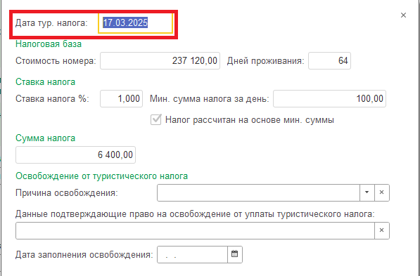 Укажите период применения в поле Применить с и установите флаг Туристический налог.