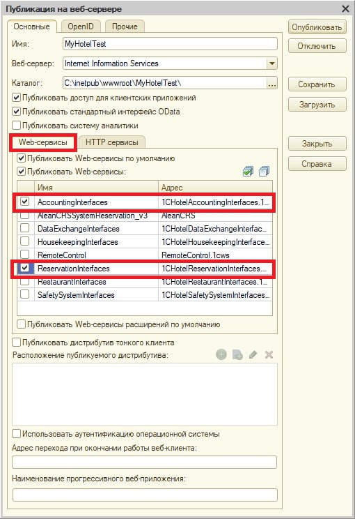 - На вкладке Web-сервисы выберите сервисы AccountingInterfaces и ReservationInterfaces, установив флаги напротив сервисов.