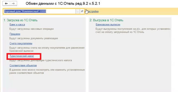 В разделе Загрузка из 1С:Отель в окне обмена данными перейдите в подраздел Туристический налог.