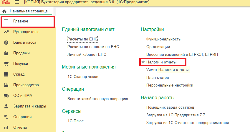 Перейдите в подсистему Главное/Настройки/Налоги и отчеты.